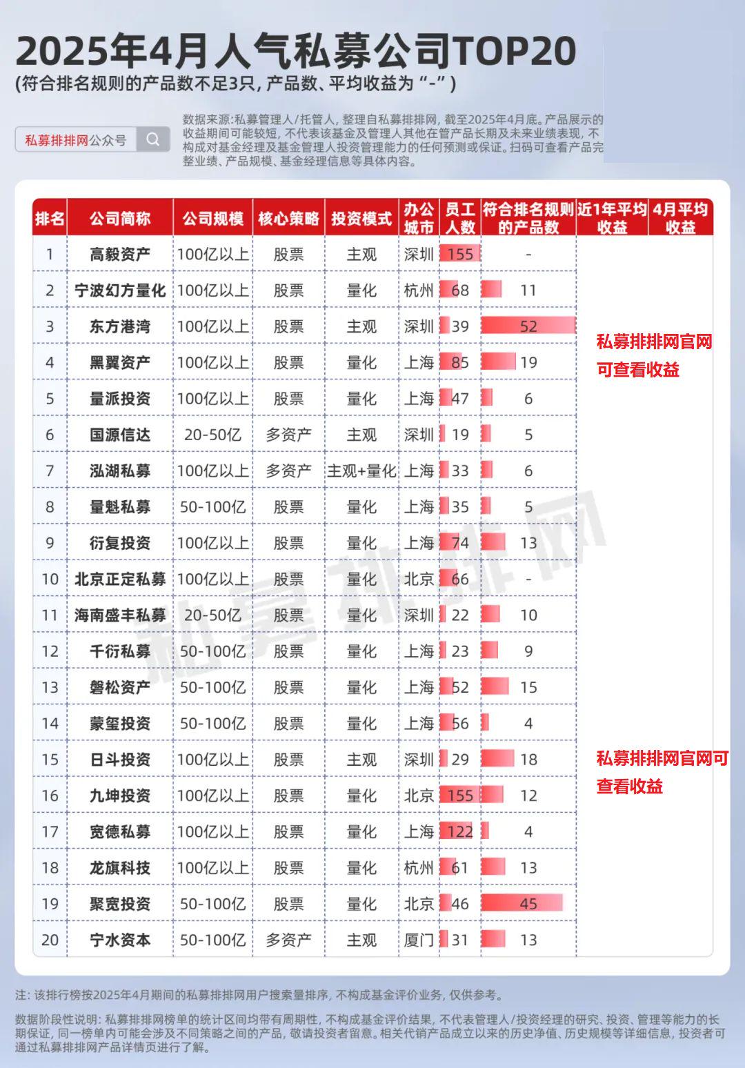 在4月人气前20的私募公司中,量化私募共有14家。从管理规模来看,百亿私募包揽前5。其中,高毅资产、宁波幻方量化、东方港湾依次位居前3。