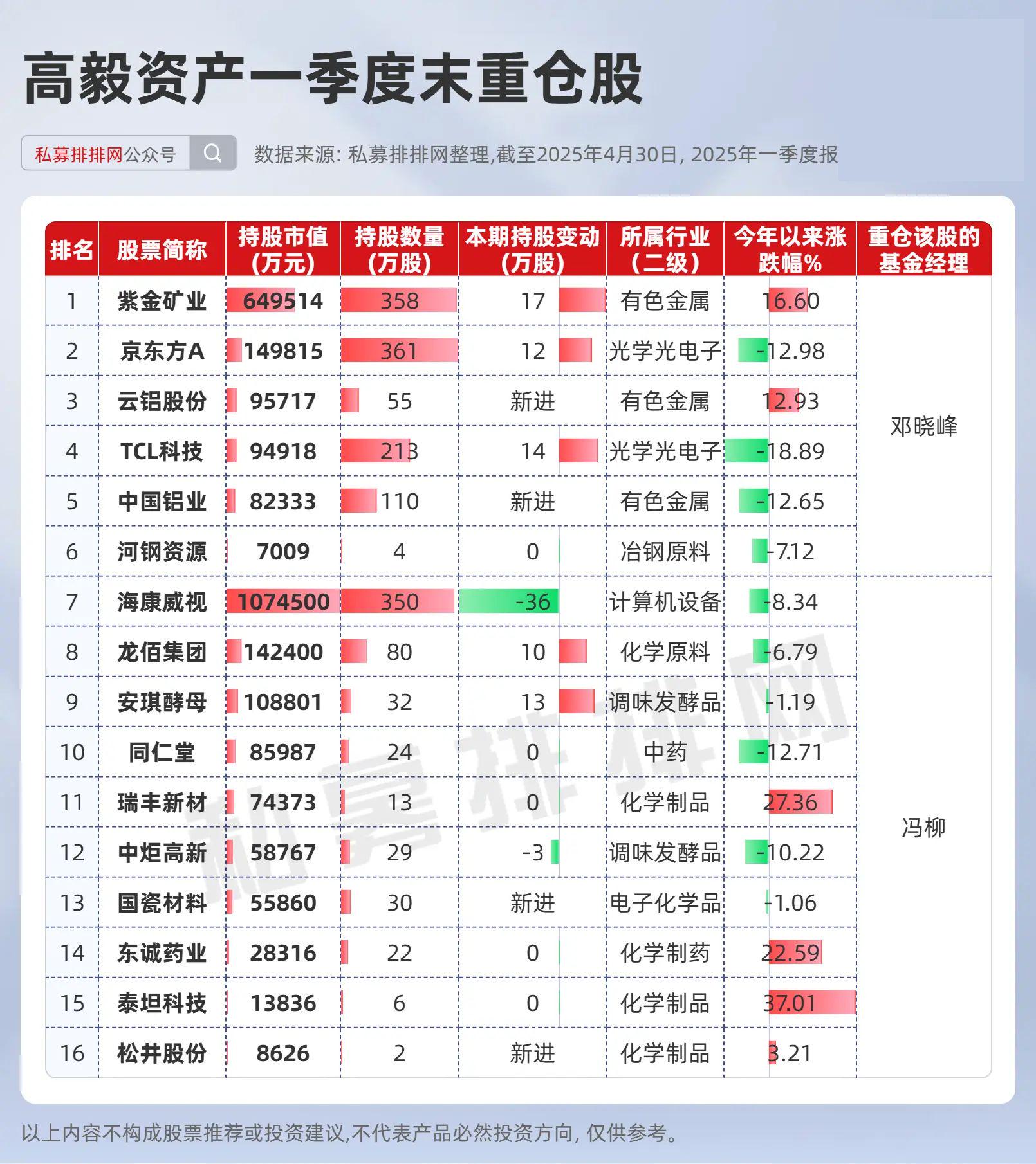 邓晓峰一向对紫金矿业偏爱有加,自2023年一季度起连续7个季度减持后,在2024年四季度恢复增持。值得注意的是,紫金矿业、云铝股份今年以来涨幅均超过10%。