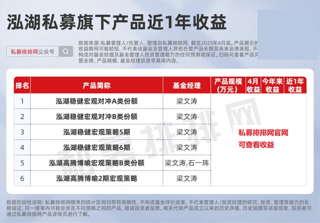人气位居第7的泓湖私募的业绩在以上20家私募中较为亮眼,近1年收益为***%,4月收益为***%。在旗下符合排名规则的6只产品中,“泓湖稳健宏观对冲A类份额”近1年收益位居第1,达到***%。