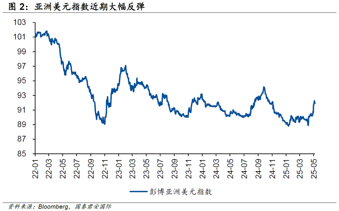 近期投资者关心的另一个问题是美元的信用担忧,与此同时也开始担忧美元可能的大幅走弱。我们试图从下面这张图来回答这个问题。从亚洲美元指数的走势来看(即亚洲货币兑美元的强弱),亚洲货币近期出现了强劲的反弹,但事实上仍然远低于2022年初的水平,从这个角度而言,对于美元的信心存在担忧是事实,但美元距离垮塌仍有一些距离。近期在不少亚洲货币升值后,若干亚洲央行也开始进场干预。日本央行也暗示将来可能会更晚和更慢升息,这在一定程度上也表明多数经济体仍然希望保持政策的灵活度,而非轻易跟随金融市场尤其是以对冲基金为主导的杠杆交易。