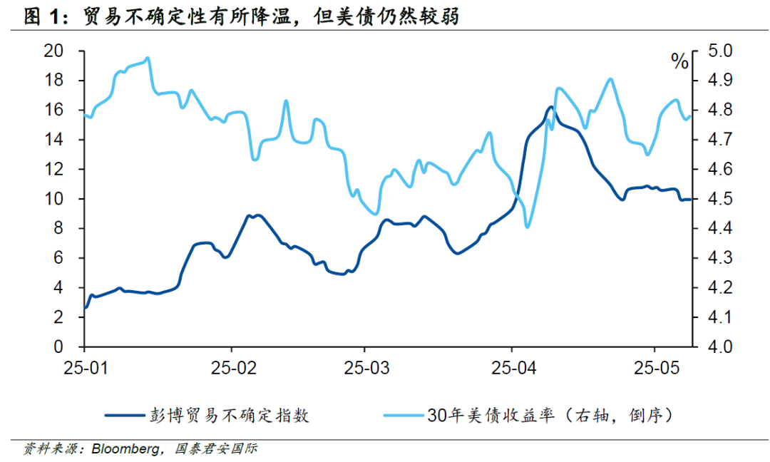 从彭博编制的贸易不确定指数来看,近期该指数其实有所下行,中美贸易谈判的即将举行,也给投资者带来了些许慰藉,但长端美债收益率大致保持平稳,这说明市场在目前阶段更为担忧的是通胀。