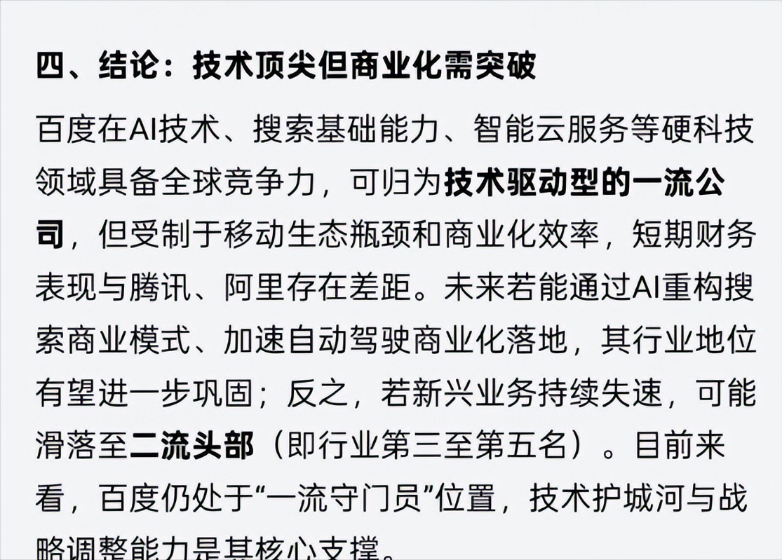 同样,不妨再来看看DS的回答。DS指出,百度只能算是二线科技公司。但是与文小言不同,DS强调,如果百度能转型成功,或许有机会跻身一线。