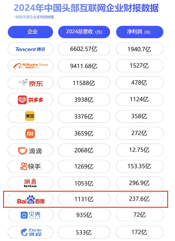 如今,百度在互联网大厂中已被挤下了顶级头部阵营的牌桌,从营收看:阿里、腾讯、小米、美团、京东、拼多多处于2000亿元规模以上;百度则为1000亿元+规模级别,排名甚至与一家卖房子的企业接近了。