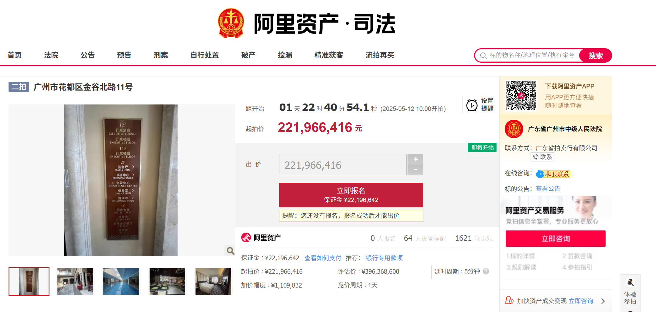 红星资本局5月10日消息,阿里资产网显示,广州富力空港假日酒店将于近日进行二拍,此次起拍价为2.22亿元。
