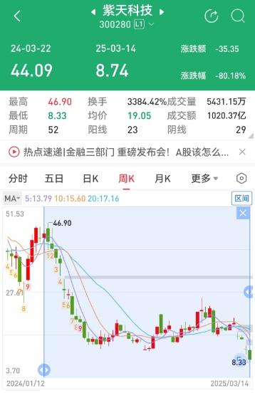 行情数据显示,随着阻碍监管执法事件的发生,2024年3月下旬至2025年3月中旬的大约一年时间,紫天科技股价累计跌幅已经超过80%。