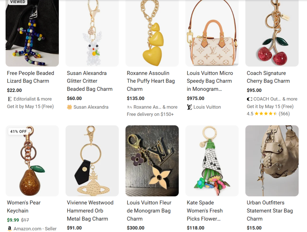 像我们偏爱的Labubu这种毛绒挂件,在欧美市场其实不太常见。比如,现在在Google上搜包挂,可以看到这些推荐结果的主要材质都是坚硬的金属和塑料。