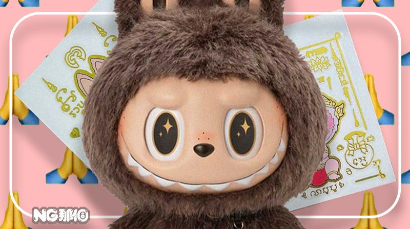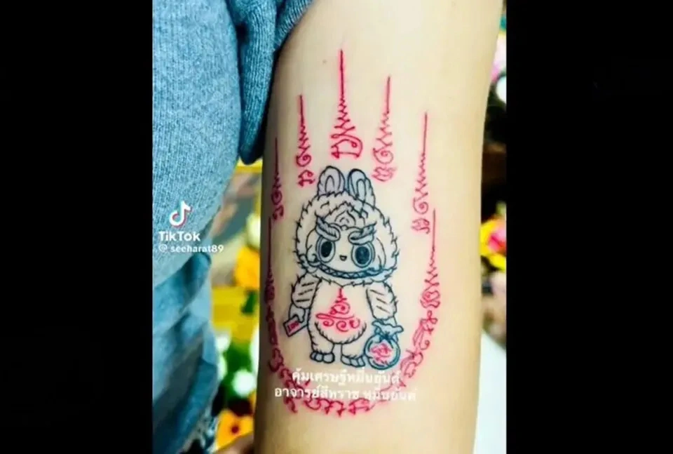甚至泰国著名的刺符纹身都为潮流的年轻人们研发出了Labubu定制版,在一系列神圣的梵文铭文中,它被当作了吉祥物,有着和貔貅一样招财的寓意。