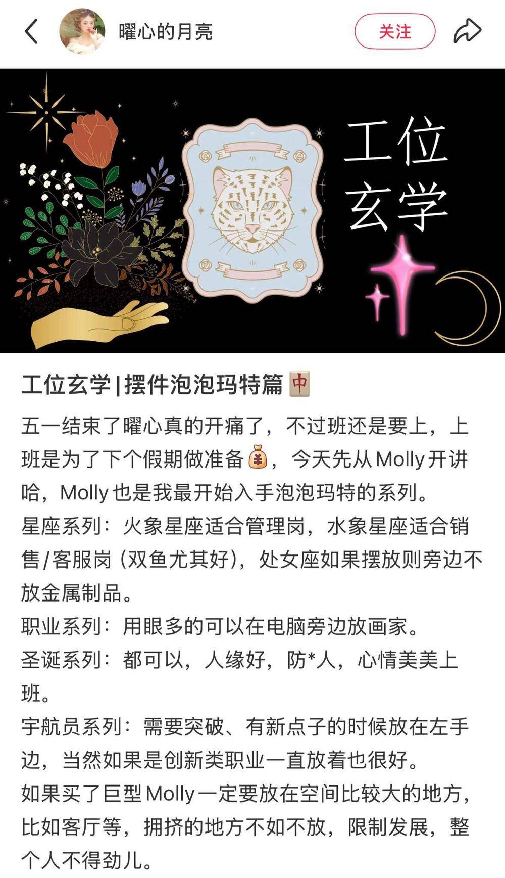 比如按照@Glory顾嘉禾的说法,Labubu这个小可爱就很适合心里摇摆不定、没主意、选择困难症的容易挨欺负的软柿子。它还可以避小人和煞气,给予主人破局的勇气和在口舌方面的能力。博主还贴心注明了:颜色不限,姿势不限,放在工位或者挂包都可。