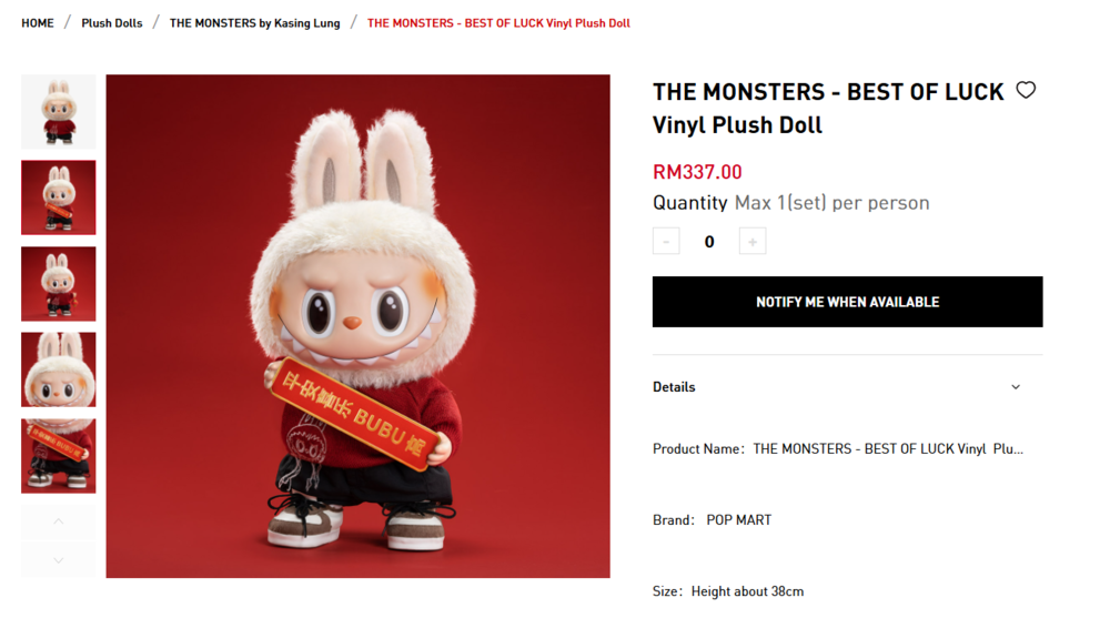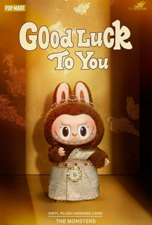 不过,我们也能从西方市场中的翻译窥到一丝代表好运的痕迹。例如下面这个泰国限定的Labubu限定的名字被直接翻译为“Good Luck to You”,新年限定的大娃“平安喜乐”也被翻译为“Best of Luck”。