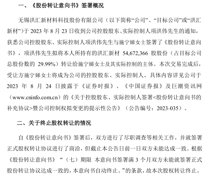 然而3个月后,洪汇新材披露终止股份转让的公告,表示自《股份转让意向书》签署后,双方进行了尽职调查等相关工作,并就签署正式股权转让协议进行了商洽,但截止本公告日前一日双方未能达成一致,故本次股权转让终止。