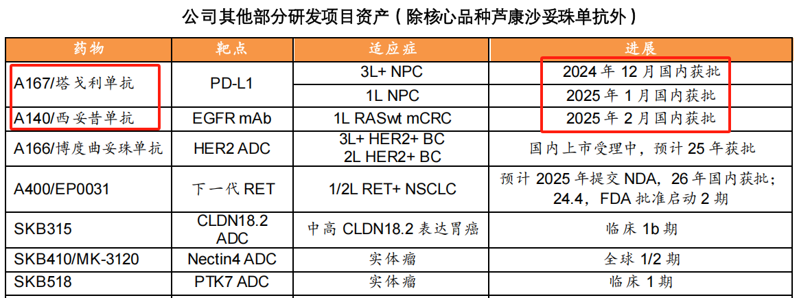 例如,SKB246的国内适应症2LEGFR突变NSCLC就已在申请上市中,预计2025年内获批;其他像塔戈利单抗、西妥昔单抗等也都进展很快,已在国内获批......