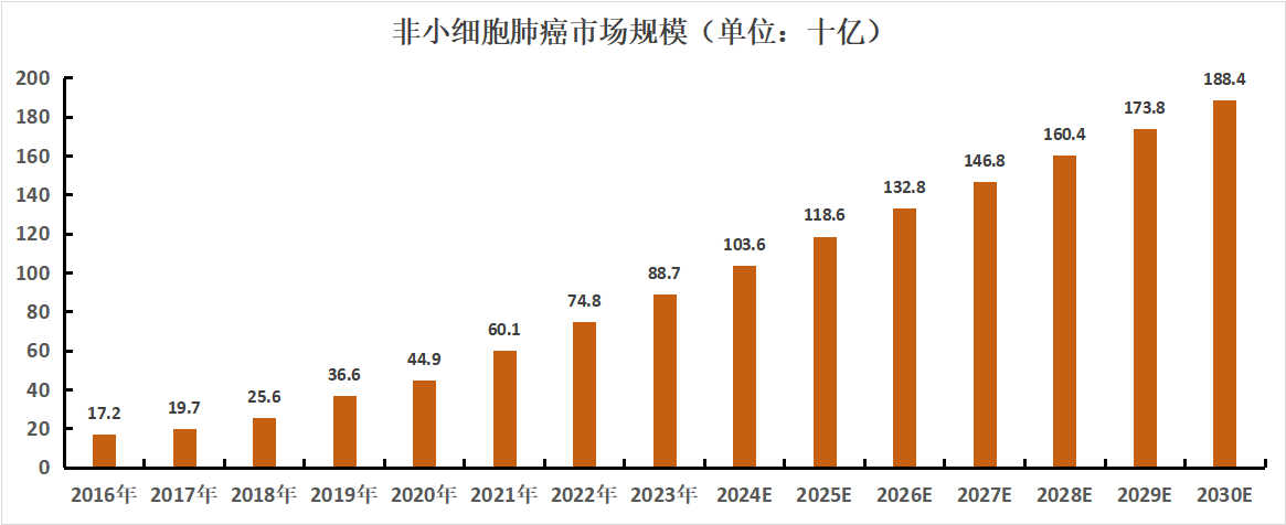 肺癌中,非小细胞肺癌占比最高,达85%,预计到2030年该病药物全球市场规模将达1900多亿。进一步细分,EGFR突变型又是亚洲患病人群中最常见的一种,占比约在40%-60%。
