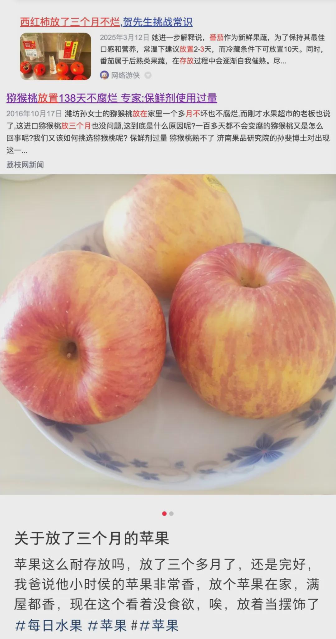 另一个让消费者感到震惊的现象是水果的“耐久性”。某科普博主进行的“苹果不朽实验”揭示了一个残酷的事实:超市购买的苹果,在恒温恒湿环境下存放了180天,依然光泽如新,而同期农家苹果则早已腐烂。