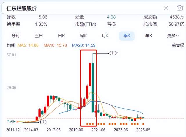 这种好事,一些“消息灵通”的牛散提前进场“埋伏”,有些高管也坐不住了,找了“壳公司”隐藏起来买自己家股票。两伙人共同努力下,仁东控股走了一波慢牛行情,股价在不到一年时间,从十几块涨到57,足足涨了4倍。
