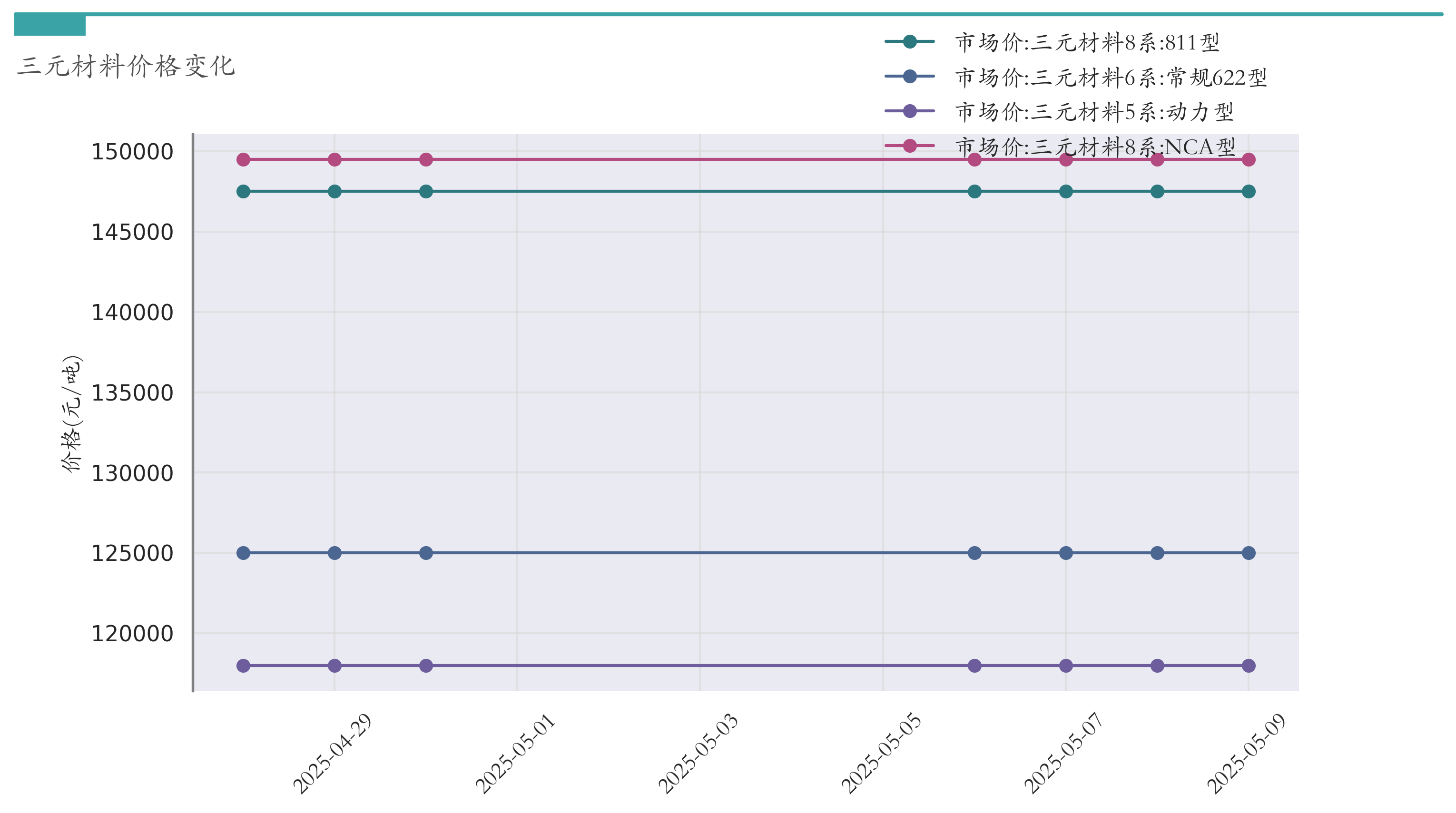 截至5月9日,三元材料8系:811型市场报价为147500元/吨,较4月30日持平。三元材料8系:NCA型市场报价为149500元/吨,较4月30日持平。三元材料6系:常规622型市场报价为125000元/吨,较4月30日持平。三元材料5系:动力型市场报价为118000元/吨,较4月30日持平。近两周三元材料价格变化如下图所示: