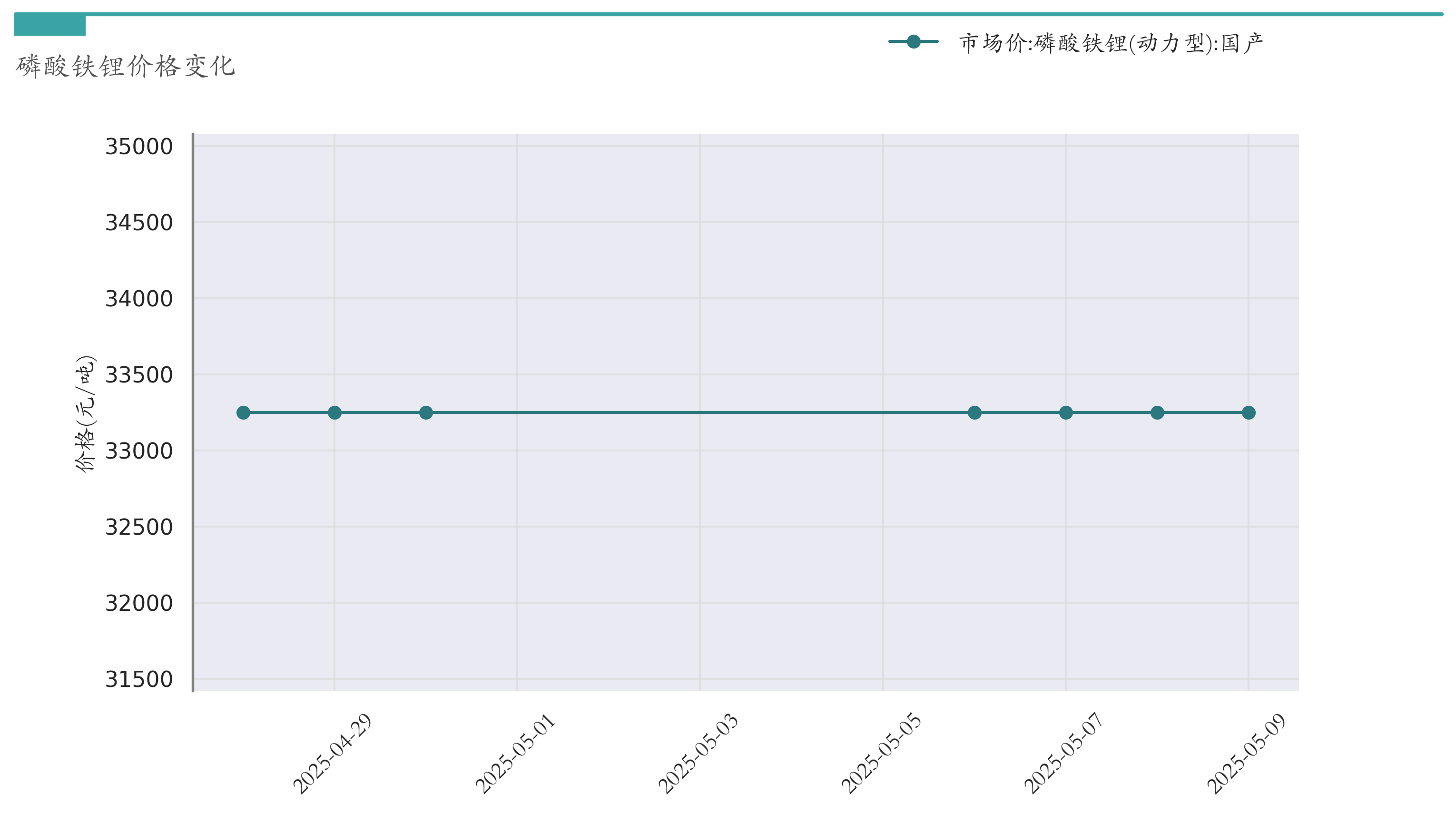 截至5月9日,磷酸铁锂市场报价为33250元/吨,较4月30日持平。近两周磷酸铁锂价格变化如下图所示:
