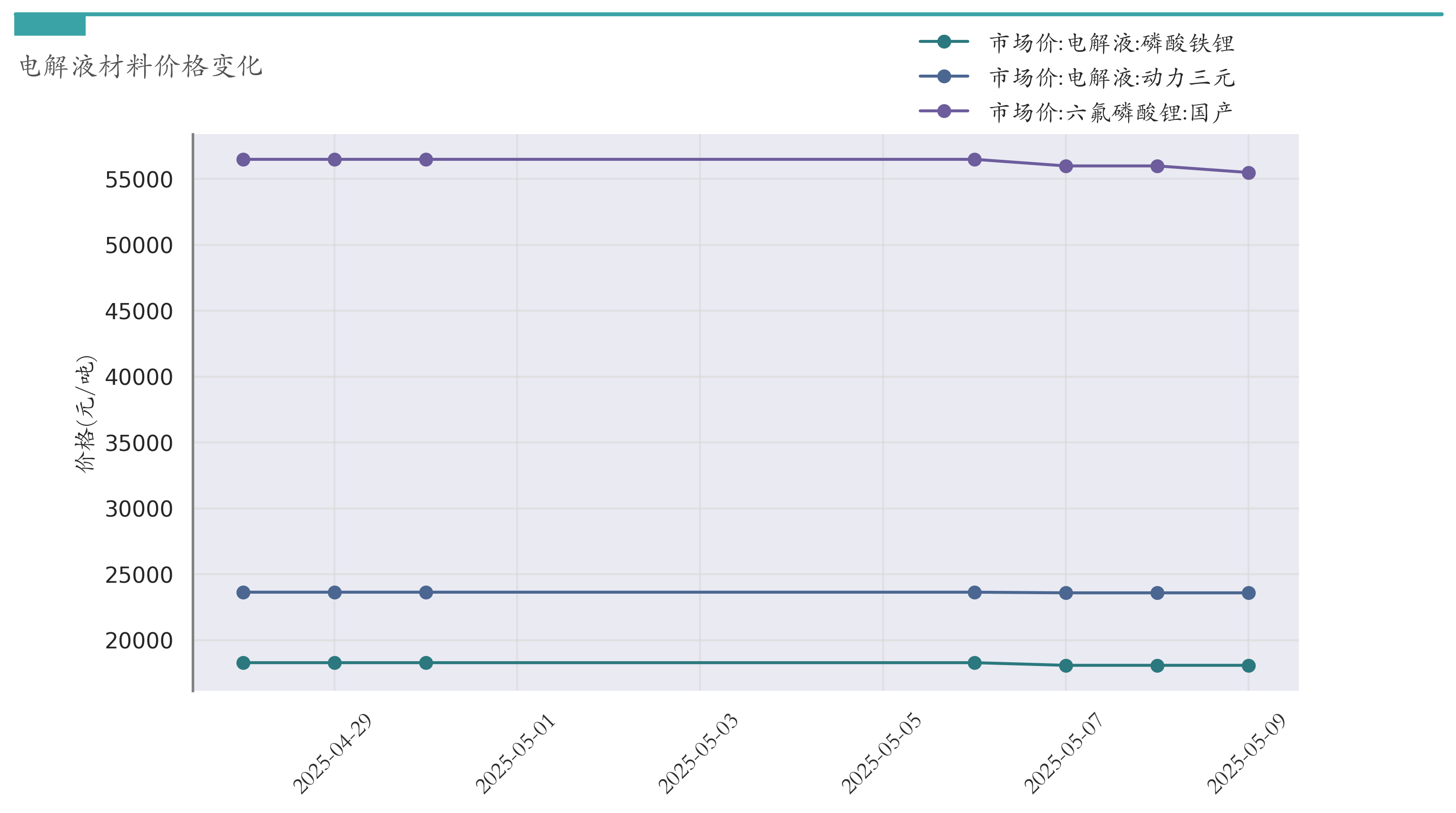 截至5月9日,六氟磷酸锂市场报价为55500元/吨,较4月30日下跌1000元/吨。电解液(磷酸铁锂)市场报价为18100元/吨,较4月30日下跌200元/吨。电解液(动力三元)市场报价为23600元/吨,较4月30日下跌50元/吨。近两周电解液材料价格变化如下图所示: