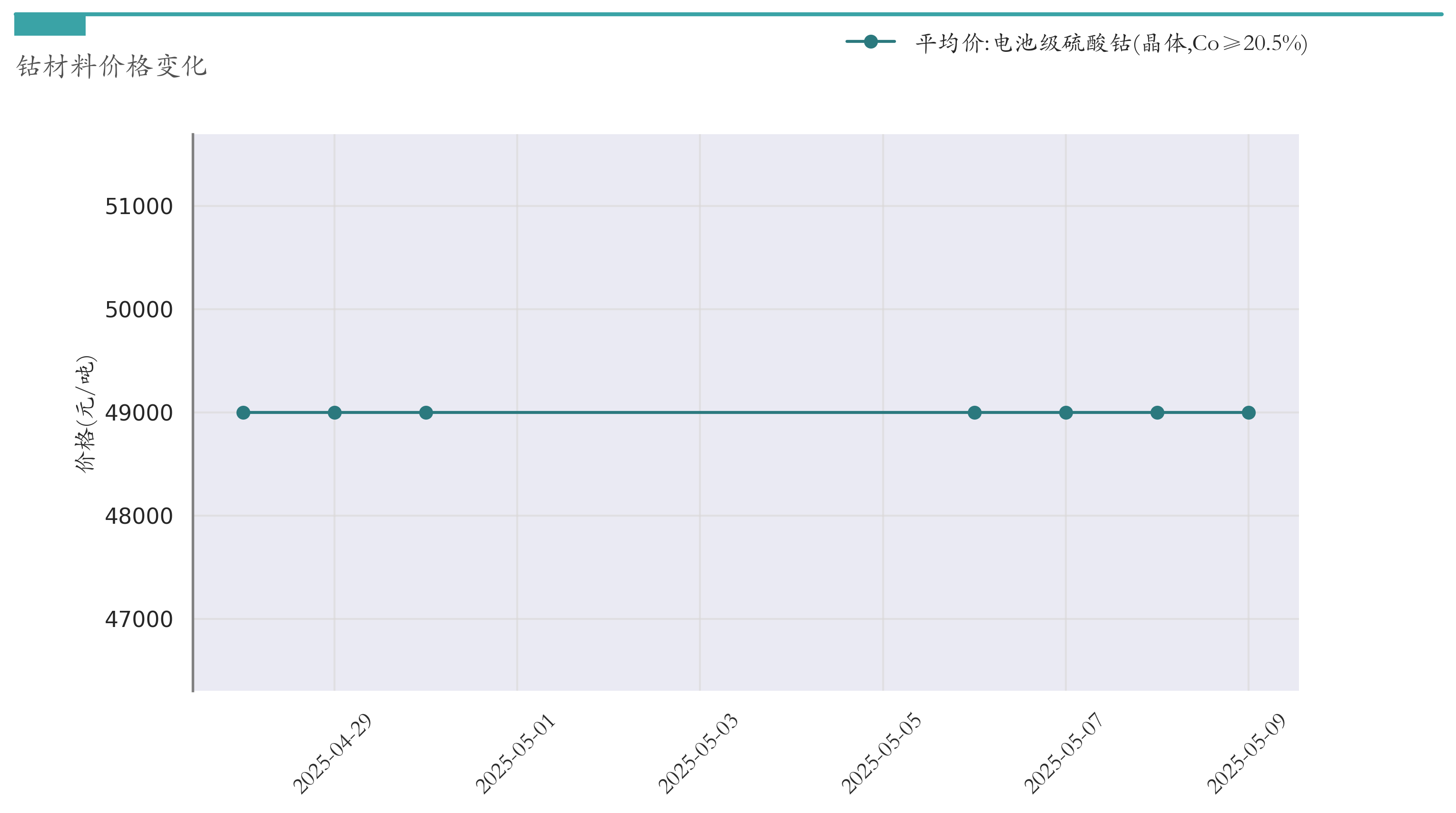 截至5月9日,电池级硫酸钴平均报价为49000元/吨,较4月30日持平。近两周钴材料价格变化如下图所示: