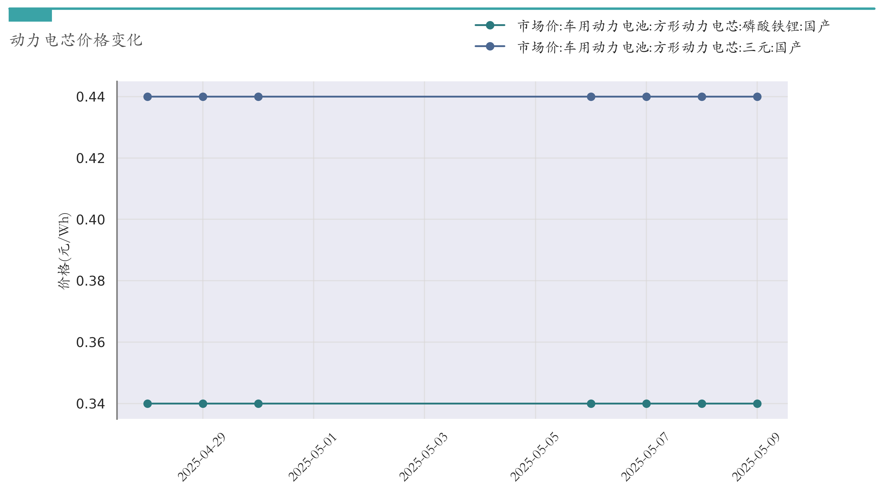 截至5月9日,方形动力电芯(磷酸铁锂)市场报价为0.34元/Wh,较4月30日持平。方形动力电芯(三元)市场报价为0.44元/Wh,较4月30日持平。近两周动力电芯价格变化如下图所示: