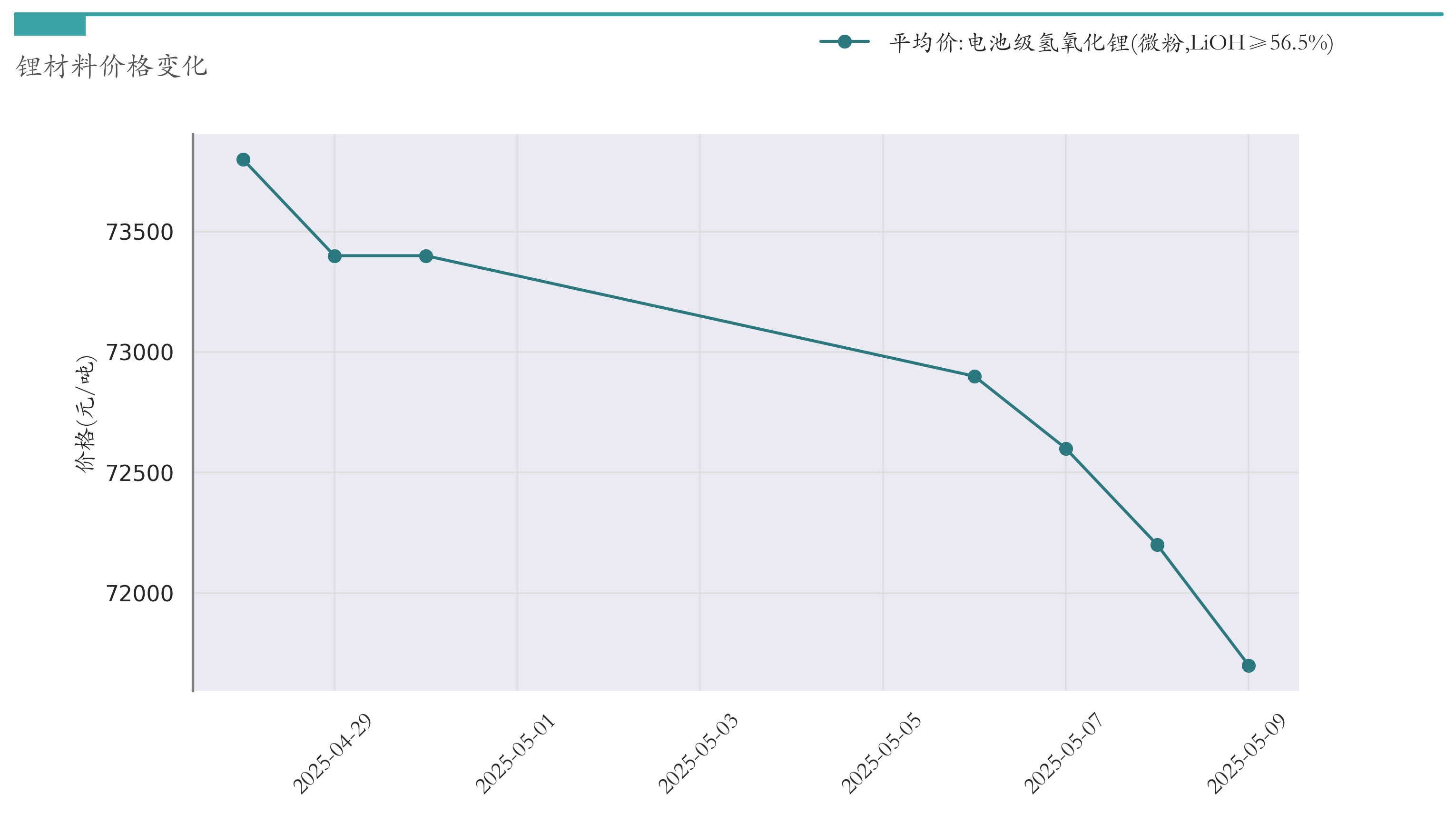 截至5月9日,电池级氢氧化锂平均报价为71700元/吨,较4月30日下跌1700元/吨。近两周氢氧化锂价格变化如下图所示: