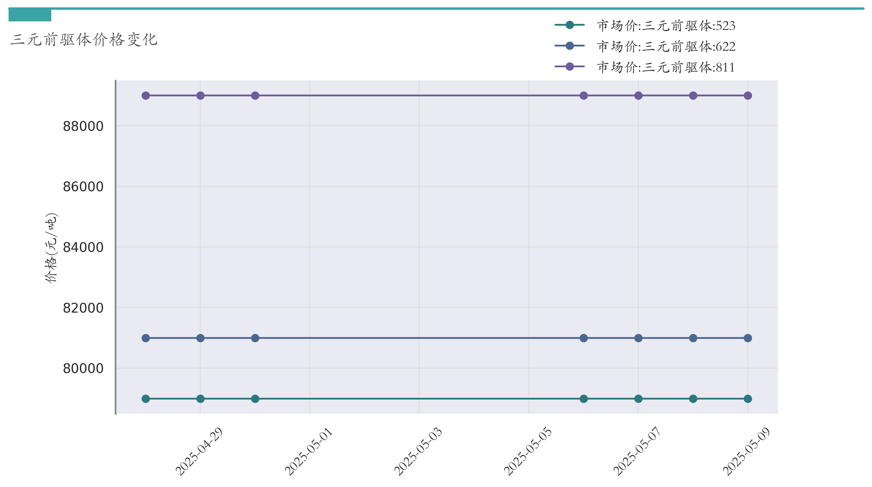 截至5月9日,三元前驱体811市场报价为89000元/吨,较4月30日持平。三元前驱体622市场报价为81000元/吨,较4月30日持平。三元前驱体523市场报价为79000元/吨,较4月30日持平。近两周三元前驱体价格变化如下图所示: