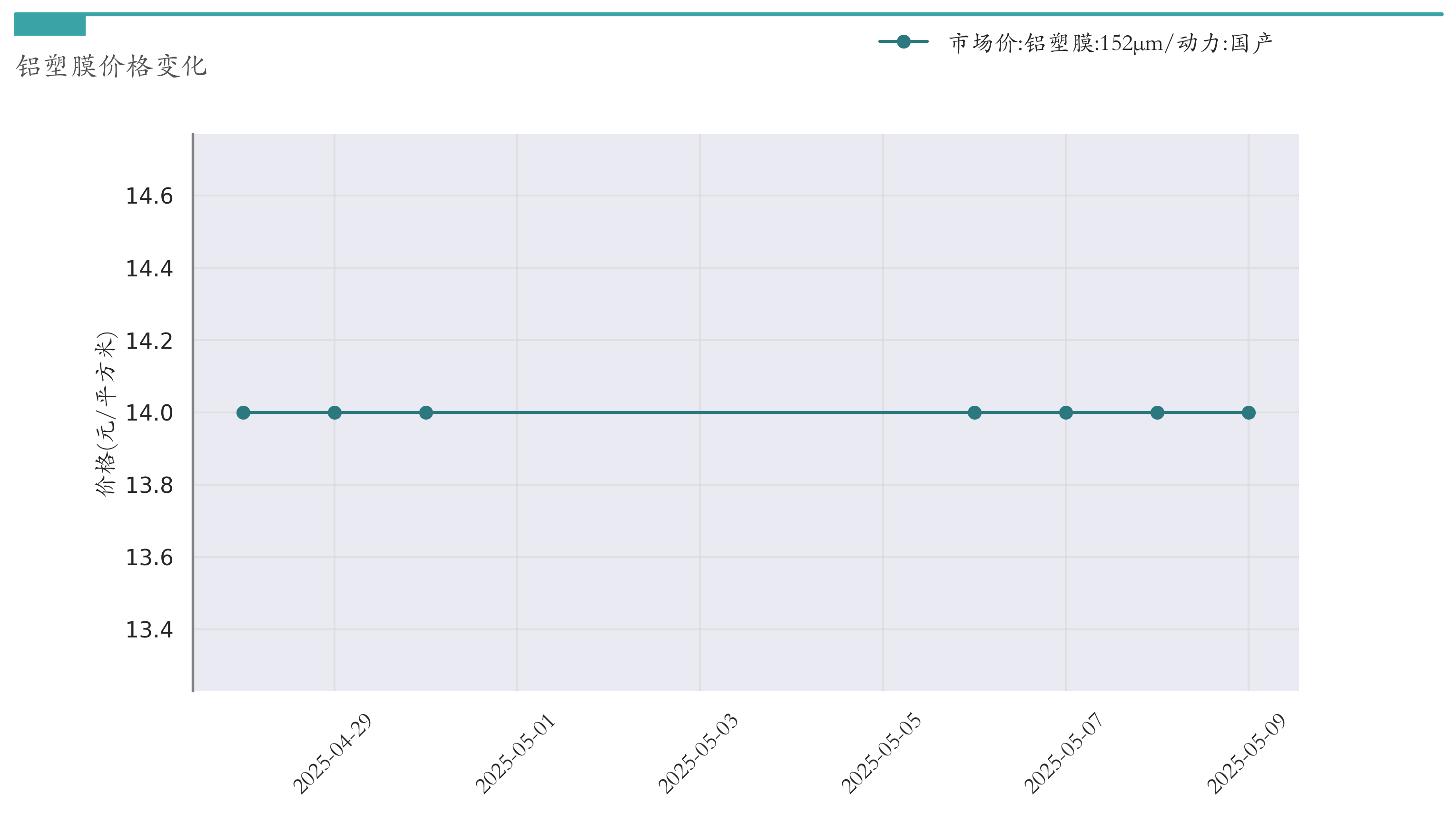 截至5月9日,152μm铝塑膜市场报价为14元/平方米,较4月30日持平。近两周铝塑膜价格变化如下图所示: