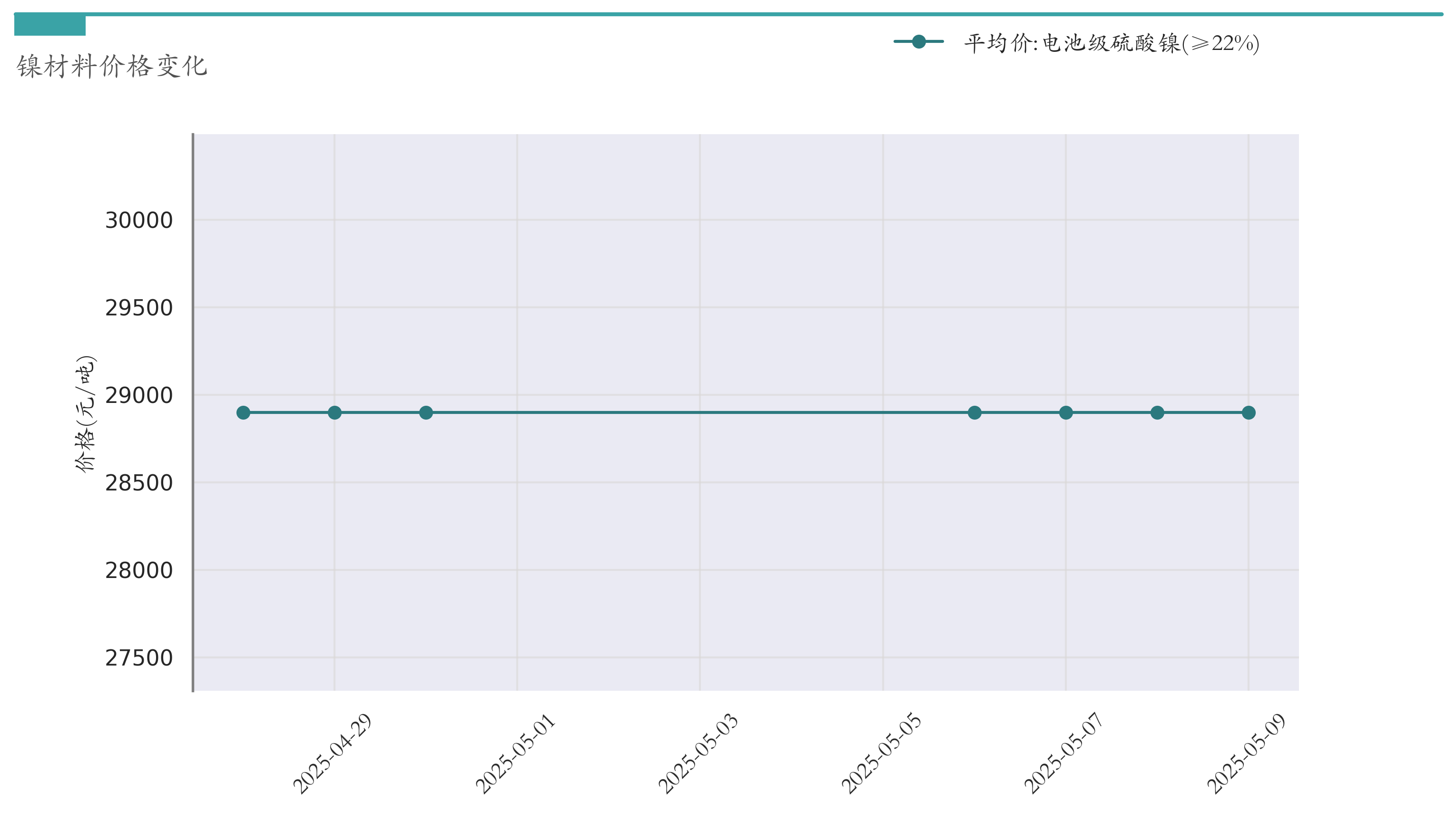 截至5月9日,电池级硫酸镍平均报价为28900元/吨,较4月30日持平。近两周镍材料价格变化如下图所示: