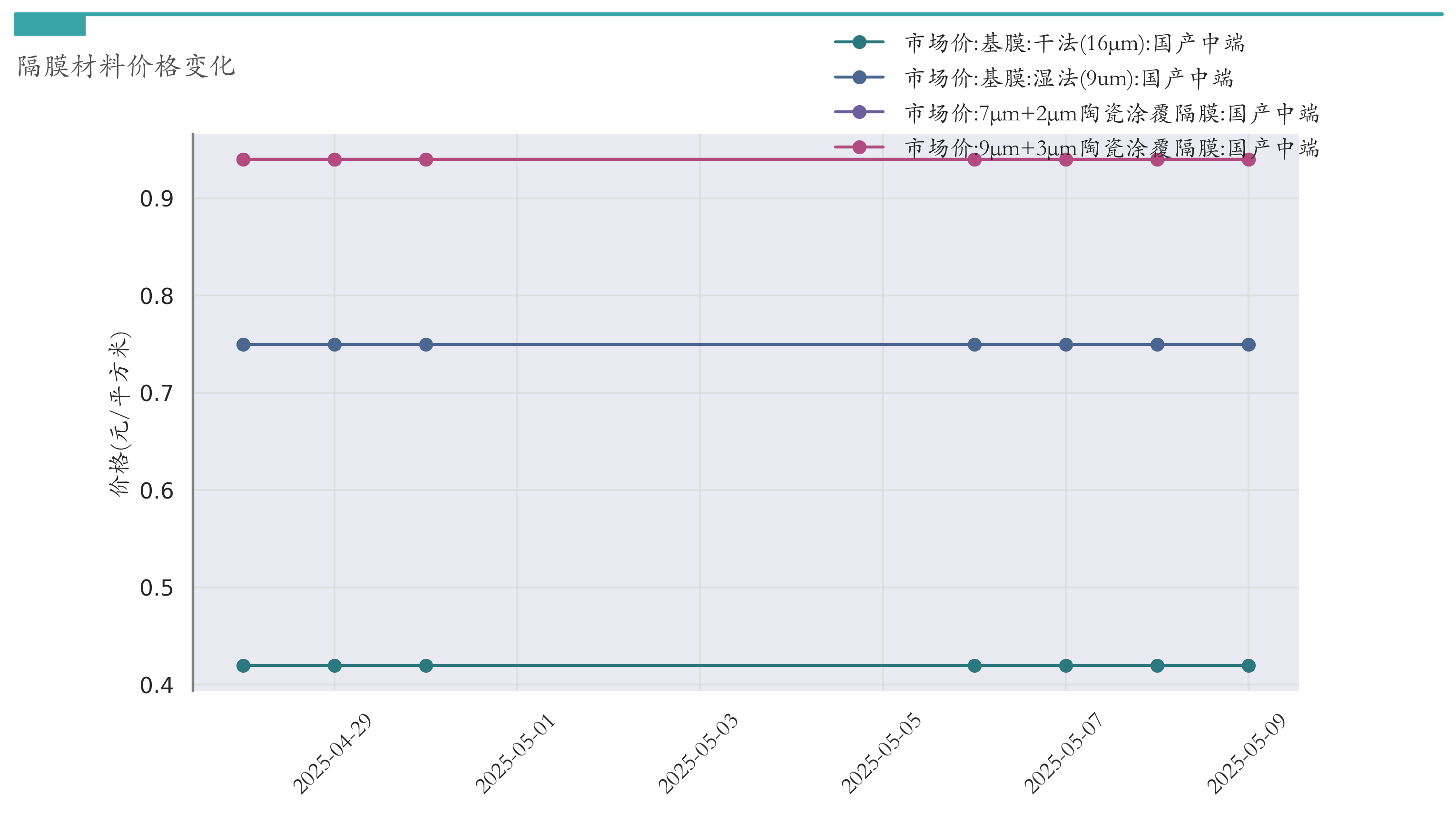截至5月9日,干法16μm基膜市场报价为0.42元/平方米,较4月30日持平。湿法9um基膜市场报价为0.75元/平方米,较4月30日持平。7μm+2μm陶瓷涂覆隔膜市场报价为0.94元/平方米,较4月30日持平。9μm+3μm陶瓷涂覆隔膜市场报价为0.94元/平方米,较4月30日持平。近两周隔膜材料价格变化如下图所示: