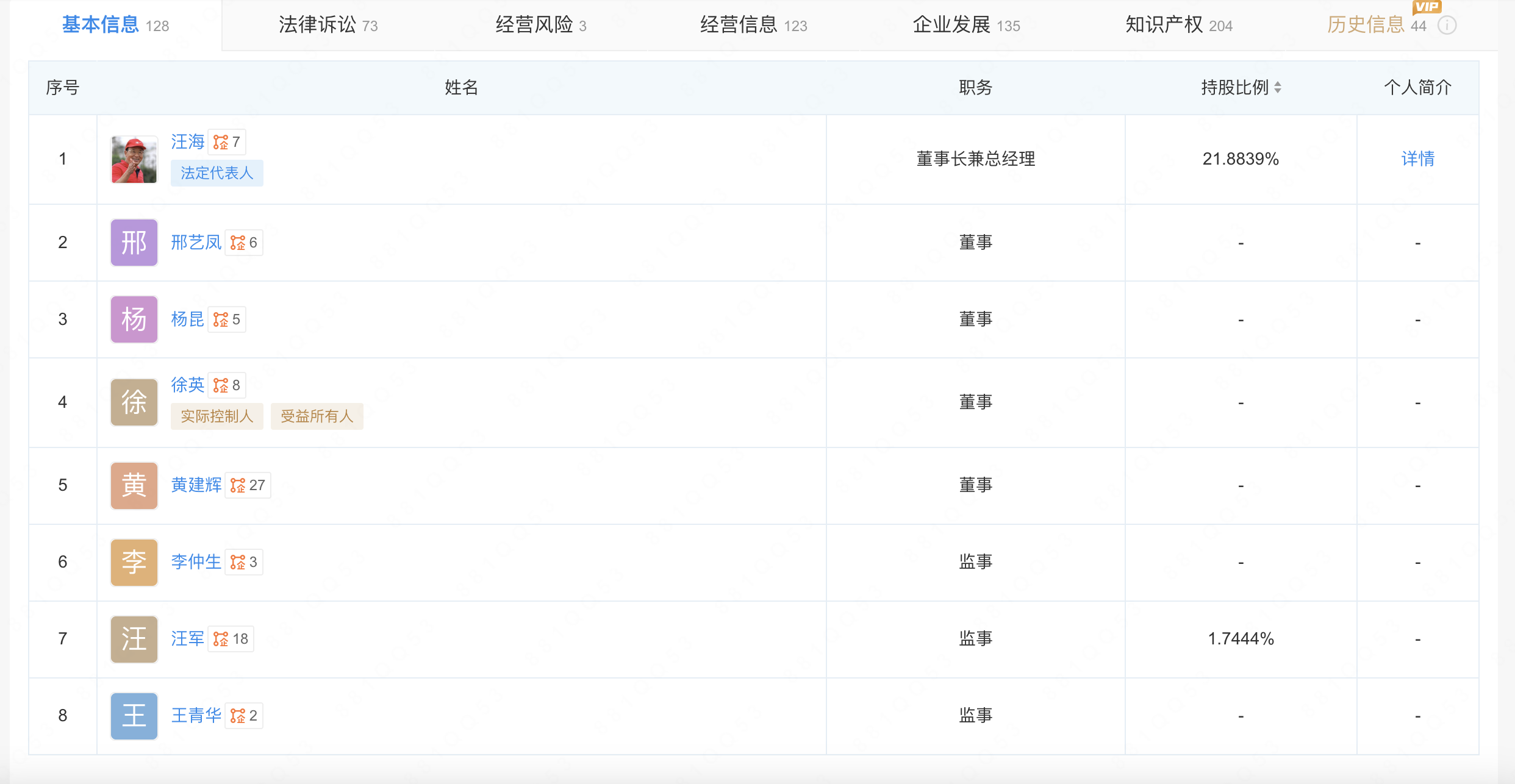 截至发稿,企查查信息显示,青岛双星名人集团股份有限公司法定代表人、董事长兼总经理仍为汪海,其在公司内的持股比例为21.8839%。徐英为公司实际控制人和受益所有人。