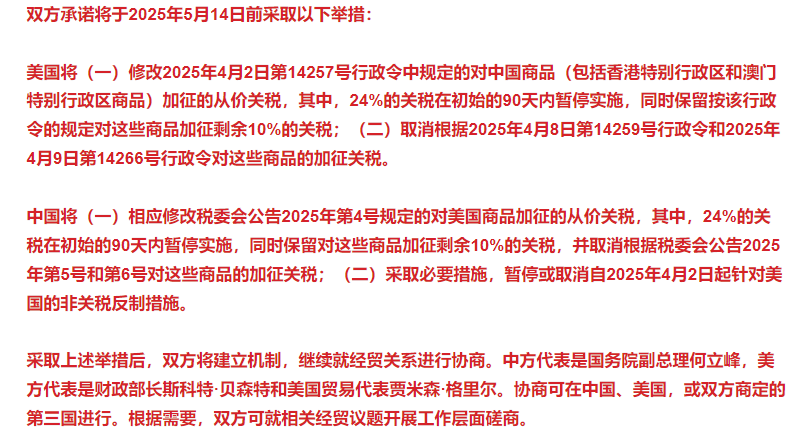 收盘后,双方发布日内瓦经贸会谈联合声明。很多人看不明白关税到底降到了多少,其实很好理解,这一次是就对等关税进行协商,也就是4月2日及之后的报复性关税。现在的对等关税是10%+可能将在90天以后征收的24%。