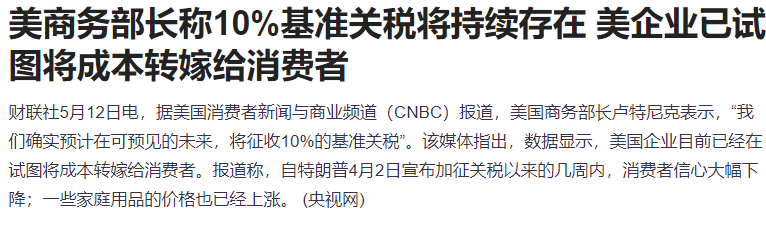 据财联社报道,美国商务部长卢特尼克表示,“我们确实预计在可预见的未来,将征收10%的基准关税”。该媒体指出,数据显示,美国企业目前已经在试图将成本转嫁给消费者。