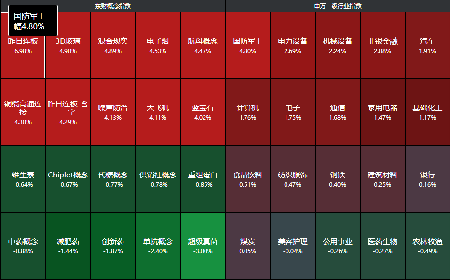 分行业来看,国防军工、电力设备、机械设备、非银金融、汽车等行业领涨,农林牧渔、医药生物、公用事业、美容护理四大行业下跌。