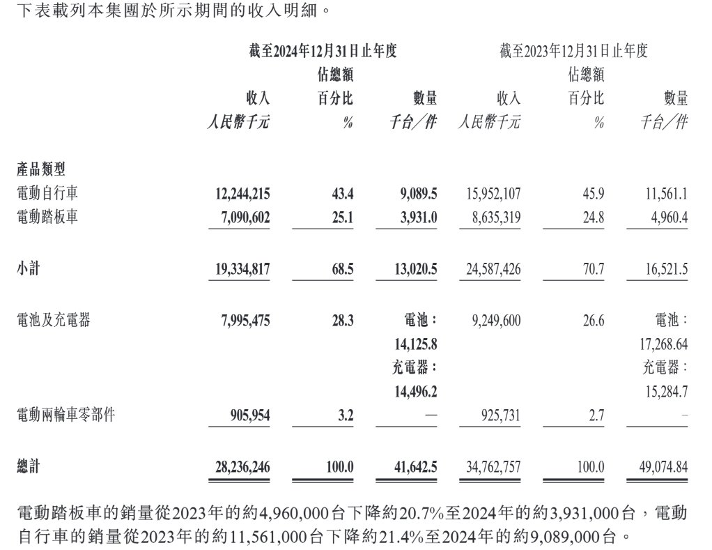 其中,主营业务电动两轮车销量下降约21%。