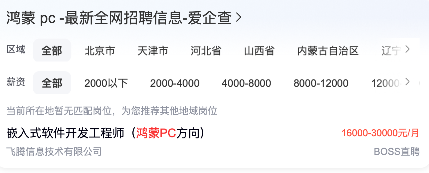 时代周报记者查阅资料发现,部分企业正在招聘鸿蒙PC方向的嵌入式软件开发工程师,月薪在1.6万元到3万元区间不等。时代周报记者还注意到,市场对鸿蒙生态开发者的招聘需求已有所降温,大量岗位以外包为主。