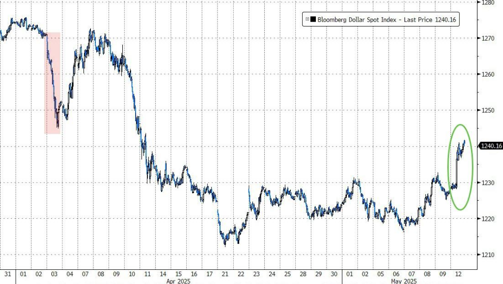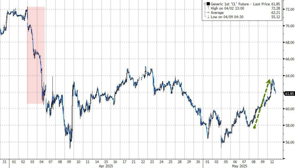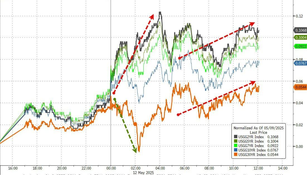 中美经贸高层会谈达成共识、大幅降低双边关税水平。三大美股指创一个月来最大日涨幅。全球贸易紧张关系缓解,经济衰退预期缓和,投资者减少对美联储降息的押注,美债和黄金跳水。原油为首的多种大宗商品走高。