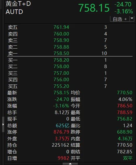 国内方面,截至下午收盘,黄金T+D大跌3.16%,报758.15元/克;沪金2508主力合约大跌2.01%,报772.28元/克。