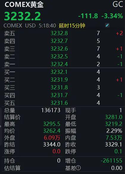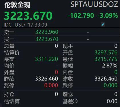 期货方面,截至记者发稿,COMEX黄金大跌3.34%,盘中最低触及3219.2美元/盎司。