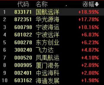 宁波海运一字涨停,国航远洋涨超18%,宁波远洋、中远海控、凤凰航运等纷纷走强。