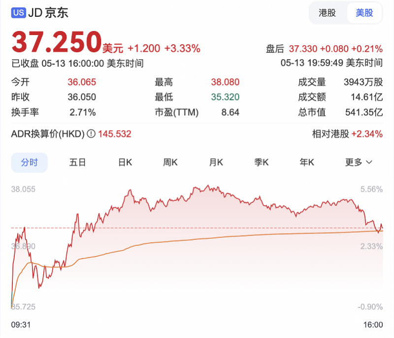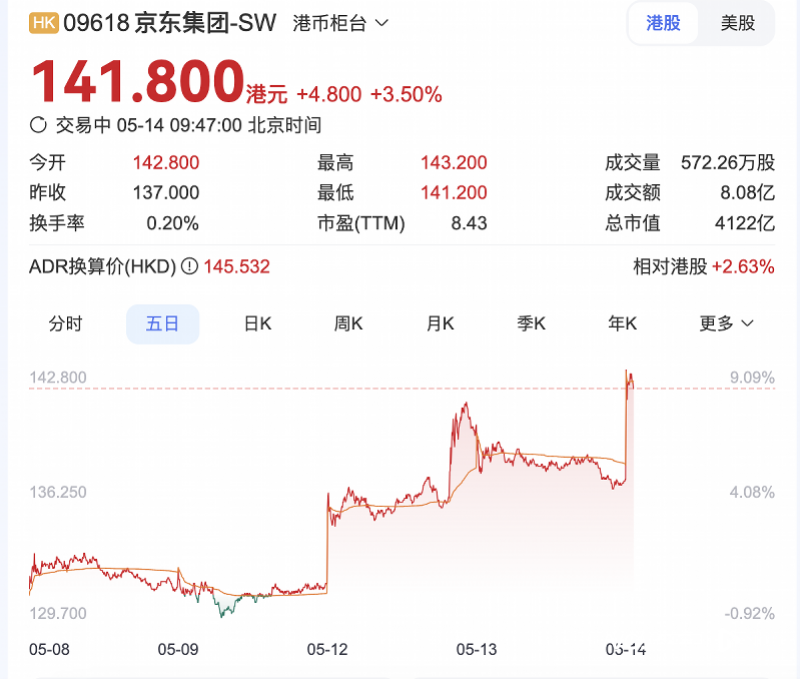5月13日,京东公布2025年第一季度财报,第一季度收入达3011亿元,同比增长15.8%,创近三年来最高同比增速,超出同期大盘增速3.4倍。今年第一季度京东净利润为109亿元,同比增长52.7%。 在业绩带动下,京东美股涨3.33%,收盘37.25美元;港股近日也连续上扬,今早开盘142.8港元,涨3.72%。