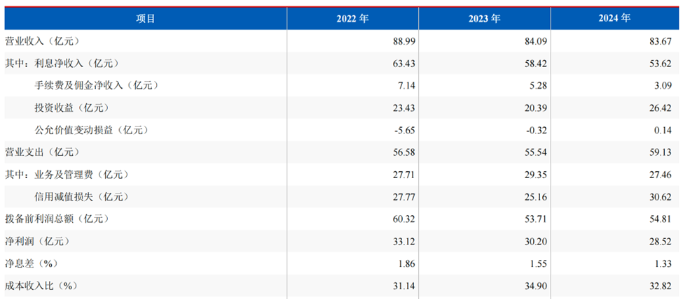 非利息收入方面,受理财业务规模下降影响,该行理财相关中间业务收入有所下滑,2024年实现手续费及佣金净收入3.09 亿元,同比大幅下滑41.48%,占当期营业收入的3.70%。