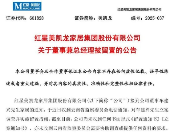 红星资本局5月14日消息,红星美凯龙家居集团股份有限公司(601828.SH,以下简称“美凯龙”或“红星美凯龙”)昨日晚间公告称,公司董事兼总经理车建兴近日收到云南省监察委员会电话通知,对其立案调查并实施留置措施。