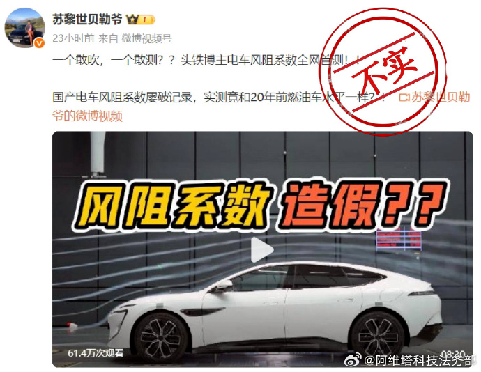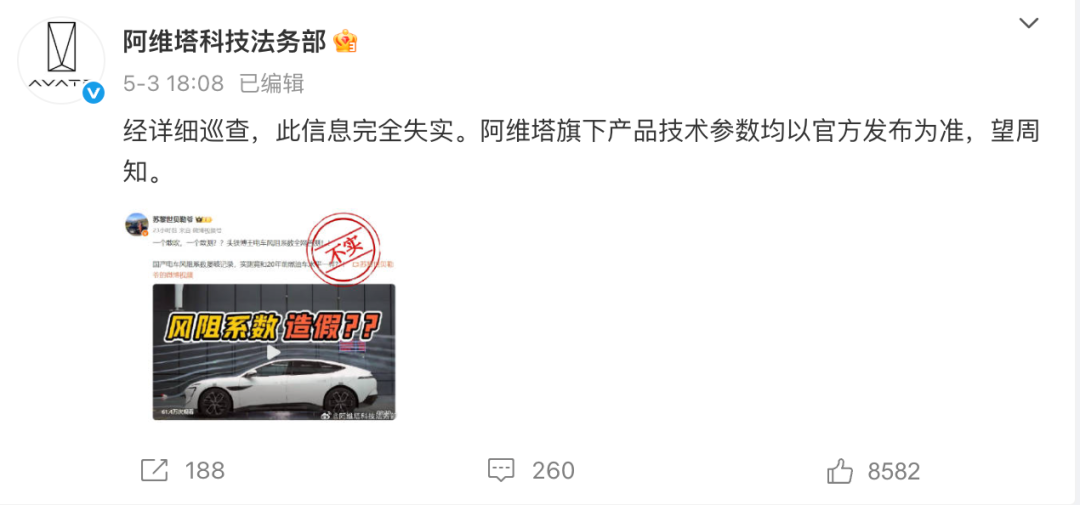 视频发布第二天,阿维塔科技法务部就发微博回应:信息完全失实,产品技术参数均以官方发布为准,望周知。随后,阿维塔还宣布,要对阿维塔12进行公开风洞测试,并邀请公众监督。
