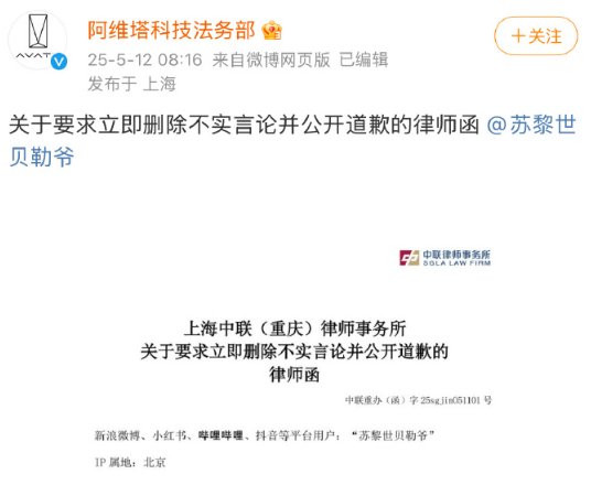 5月12日,阿维塔科技法务部给博主@苏黎世贝勒爷 发出律师函,要求其删除所发布针对阿维塔不实言论的文章和视频,并就侵犯阿维塔名誉权的新闻,发布道歉声明。