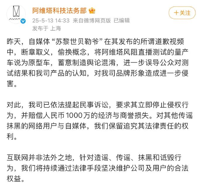 5月13日,@阿维塔科技法务部 发文称,@苏黎世贝勒爷 发布的所谓道歉视频中,断章取义,偷换概念,蓄意制造舆论混淆,进一步误导公众对测试结果和阿维塔产品的认知,对其品牌形象造成进一步侵害,已依法对其提起民事诉讼,并索赔1000万的经济与商誉损失。