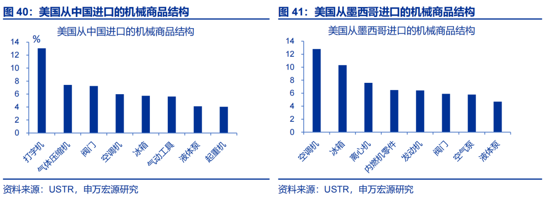 三是,美国从墨西哥、日本、德国进口较多电气设备与机械设备,但细分商品与中国也完全不同。电气设备方面,美国从我国进口的电气商品结构中蓄电池占比最高为27.5%;从墨西哥进口的主要为绝缘电线,占比为26.8%。机械设备中,美国从中国进口的机械商品中最多的为打字机(13.0%)、气体压缩机(7.4%)等。从墨西哥进口的最多的为空调机(10.8%)、其次为冰箱(8.7%)等。此外,虽然美国从德国与日本进口的机械商品份额也较大,但其进口的具体商品也与进口中国的不同,主要为发动机和大型机械。这显示我国电气设备中的蓄电池、热水器,以及机械设备中的打字机、气体压缩机具有难替代性。