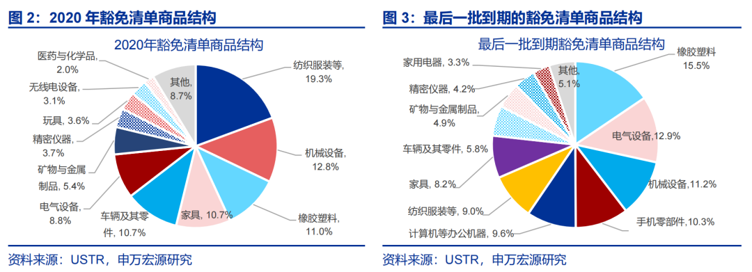 值得注意的是,“豁免清单”到期前半年内会出现“抢出口”现象,且主要“抢”的为纺织服装、机械设备和家具。“关税豁免清单”到期意味着关税税率也会上升,因此在清单到期前,也存在“抢出口”行为。通过观察50批清单到期前美自华进口占比幅度变化,发现其中33批在豁免清单到期前半年内,美自华进口占比会大幅上升,占比平均上升6个百分点。相应的,关税豁免到期后,美自华进口占比也会下行6个百分点左右,而且持续时间要比“抢出口阶段”更长。从商品结构上来看,主要“抢”的为纺织服装、机械设备、家具等,分别占总豁免商品的11.8%、10.9%和10.6%。