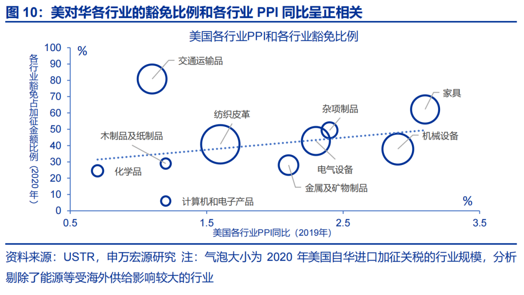 原因二:关税导致行业成本上升,数据上反映为“加税比重高-行业PPI涨幅大-豁免比例大”的影响链条。参考关税1.0时期,2019年美国对华加征关税的商品占行业总进口比重越高的行业,其PPI同比涨幅也越显著。例如,家具(PPI同比为3.1%)、机械设备(2.9%)、杂项制品(2.4%)、电气设备(2.3%)、金属矿物制品(2.1%)等。因此,为了缓解因关税导致的成本压力,2020年美国豁免商品中,上述行业的豁免比例也较高,其中家具豁免比例为62.2%、机械设备为37.9%、杂项制品为49.4%、电气设备为42.8%、金属矿物制品为28.0%。