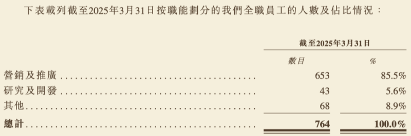 尽管德镁医药表示为丰富产品管线产生了较高研发开支,但从研发投入及其占比来看,公司的研发投入规模及占比始终低于销售费用,这一差距在人员配置上体现得更为明显。招股书显示,公司营销及推广团队高达653人,占总员工数的85.5%,而研发团队仅有43人,占比5.6%。从以上数据来看,尽管医药行业普遍需要高研发投入来维持竞争力,但公司的资源分配明显向营销端倾斜。