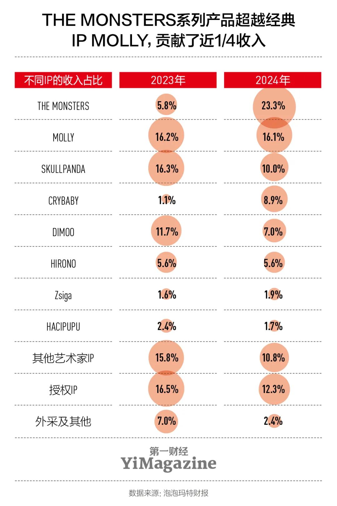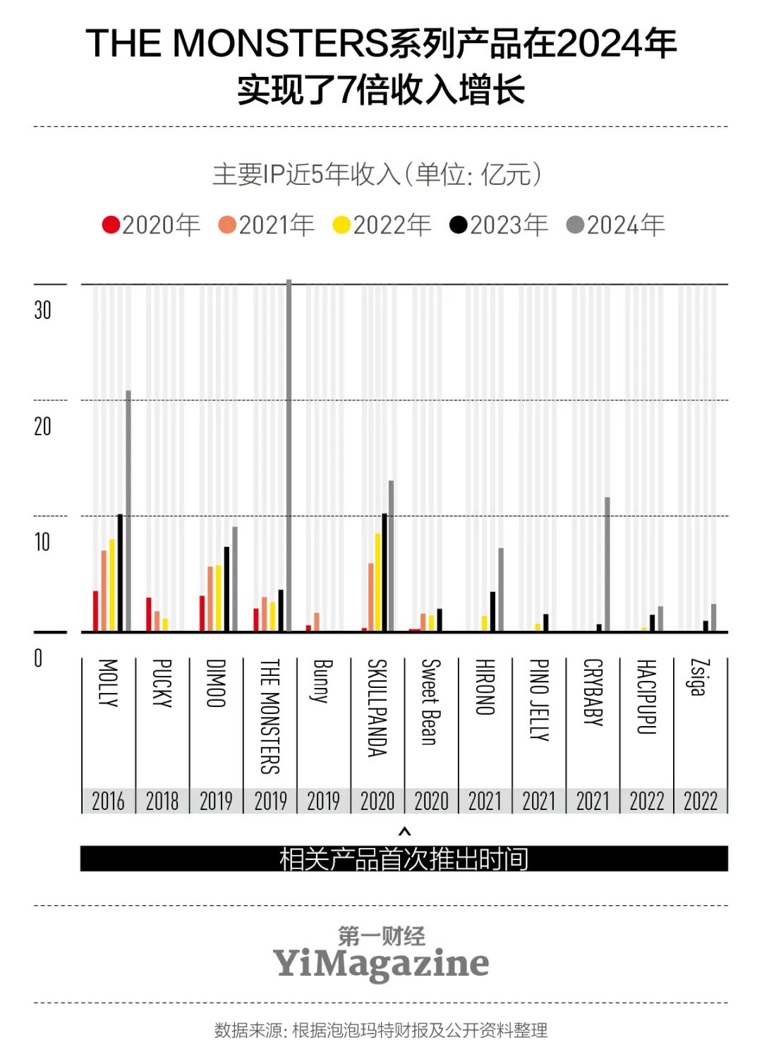 2024年,THE MONSTERS、MOLLY、SKULLPANDA和CRYBABY 4个IP的收入均突破了10亿元,其中,THE MONSTERS的产品实现了30.41亿元的收入,同比增长726%,贡献了公司总收入的23.3%,是泡泡玛特2024年最赚钱的IP,也是众IP中最大的黑马。在此之前,MOLLY、DIMOO和SKULLPANDA自2020年起始终是泡泡玛特IP产品的收入前三名。