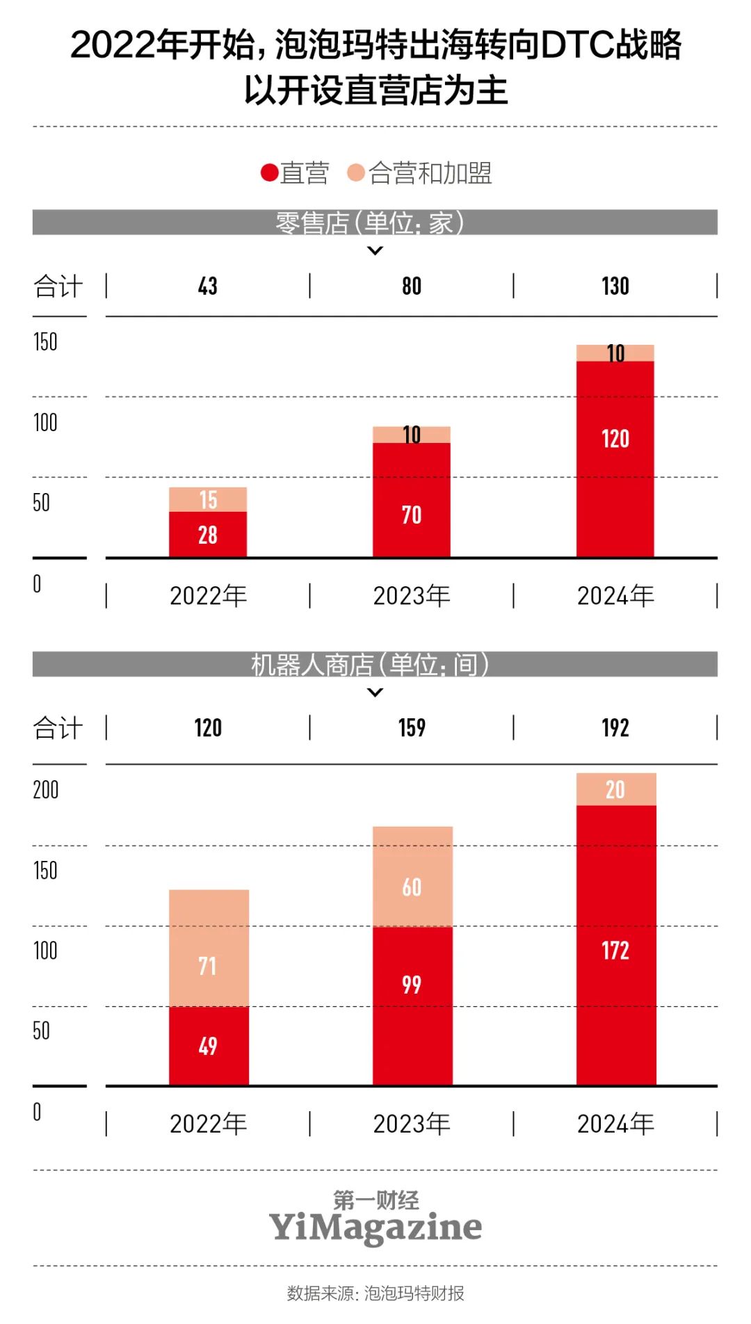 从2022年起,泡泡玛特开始强调DTC(Direct to Customer)战略,逐渐收缩海外的to B业务。2022年到2024年,无论是零售店还是机器人商店,合营店和加盟店的数量都在减少,同时加快了直营店的扩张。2024年是泡泡玛特在海外开店最快的一年,一年里新开了50家门店,并且均为直营店。